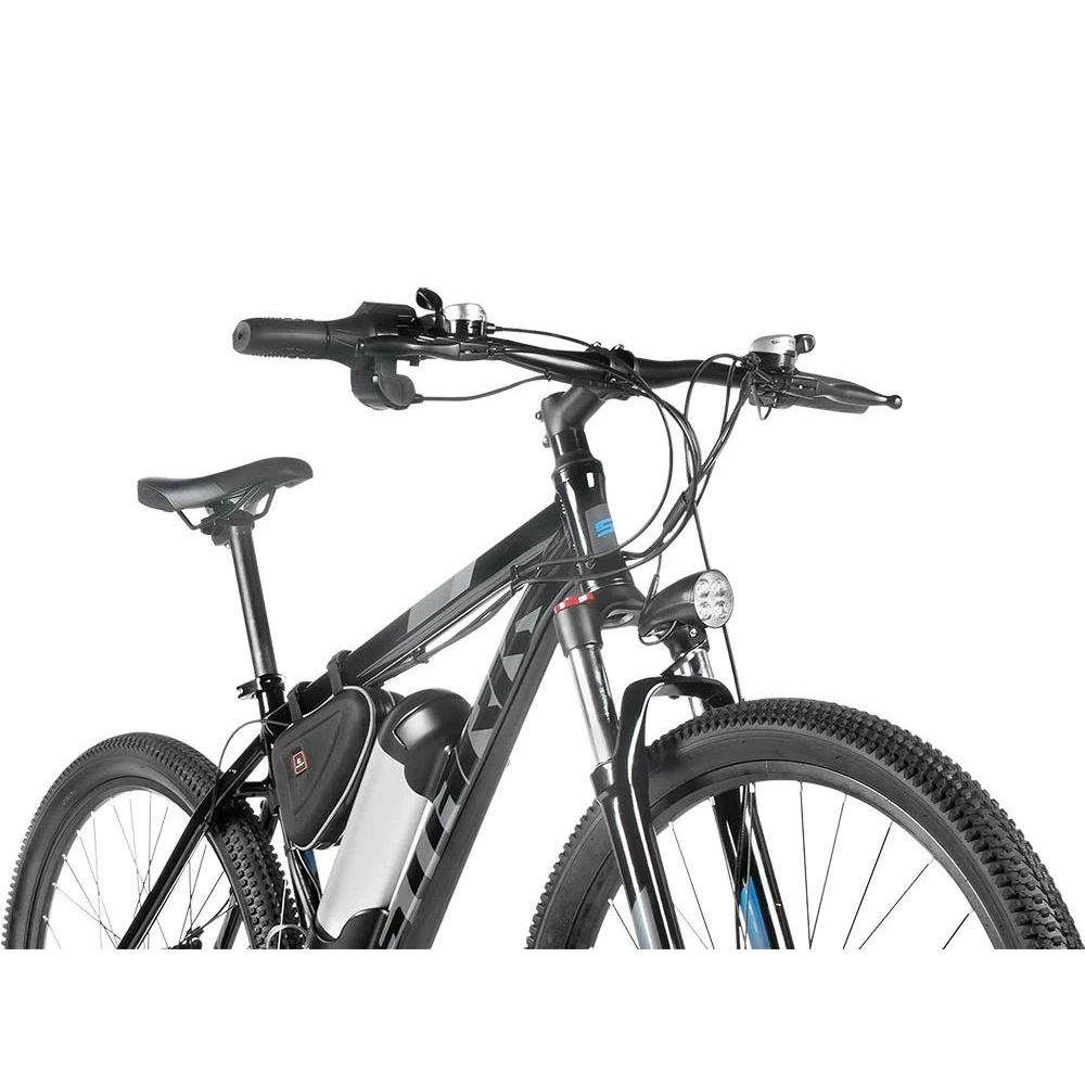 Конструкция техники представлена цельной рамой. Изготовлена из облегченного алюминия, не теряющего первоначальных характеристик при механическом воздействии. 27,5 дюймовая колесная часть отлично сцепляется с грунтом и другими поверхностями, минимизирует форс-мажорные риски. Функционал электровелосипеда максимально полезный. Имеется звуковой сигнал, информационный дисплей, половинчатая ручка управления скоростью. Удобные седло и руль регулируются согласно параметрам райдера. Наличие амортизаторов обеспечивает плавность езды по пересеченной местности.