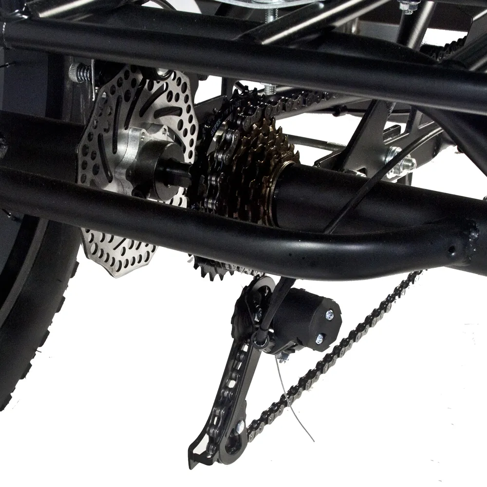 Современный трицикл представлен стильным заметным дизайном. Вызывает удивление и  зависть со стороны других райдеров. Основная конструкция техники изготовлена из долговечного прочного металла, не деформирующегося при максимальной нагрузке 180 кг. Тормозная система – дисковая, механическая, гарантирует своевременное торможение и безопасность передвижения пользователя.
