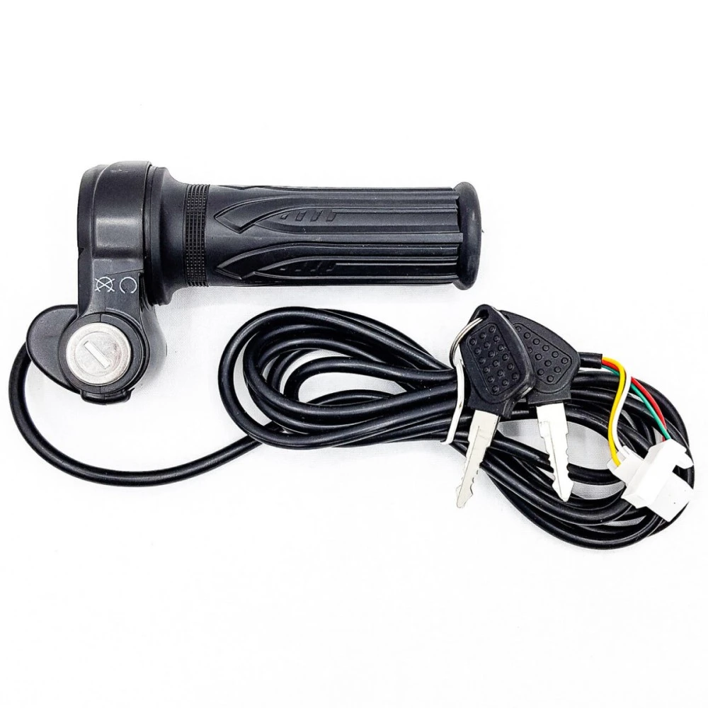 В комплекте: грипса (рукоятка), замок зажигания с ключем, кнопка переключения скорости, акселератор (газуля), шнур (кабель)